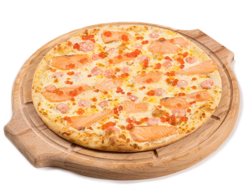 Пицца с белым соусом и сыром "Моцарелла", В составе также слабосолёная сёмга, маслины, лук и помидоры. Специи придают блюду пикантность.