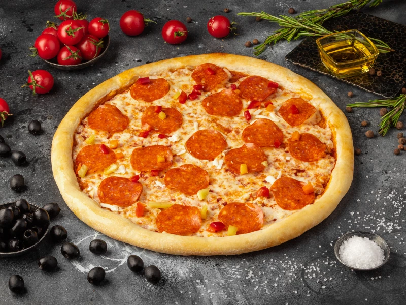 Всеми любимая и самая популярная в мире пицца "Пепперони" Классический состав пиццы в котором нет ничего лишнего: пряные колбаски пепперони, соусом итальянский, сыром "Моцарелла" и перец болгарский .